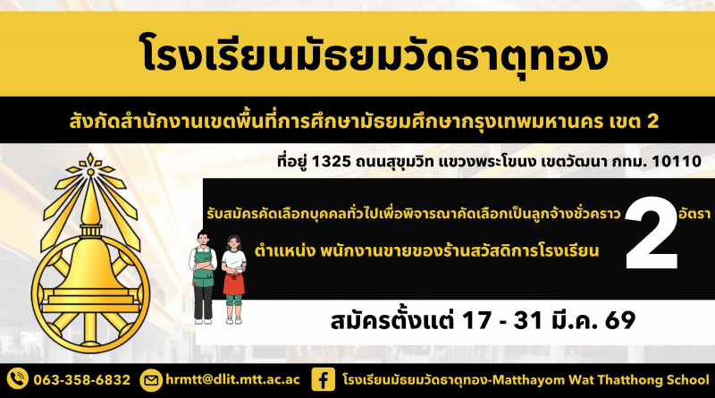 ประกาศรับสมัครคัดเลือกบุคคลทั่วไปเพื่อพิจารณาคัดเลือกเป็นลูกจ้างชั่วคราว ตำแหน่ง พนักงานขายของร้านค้าสวัสดิการโรงเรียนจำนวน 2 อัตรา