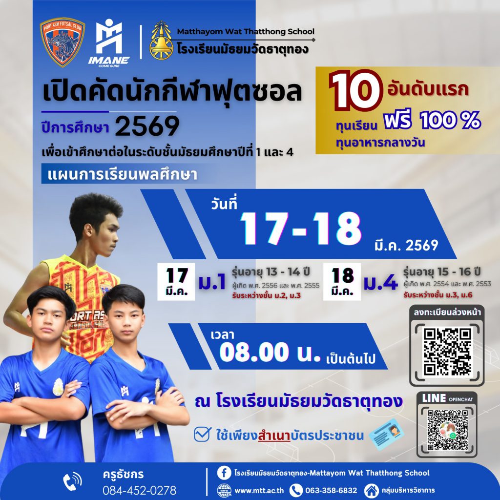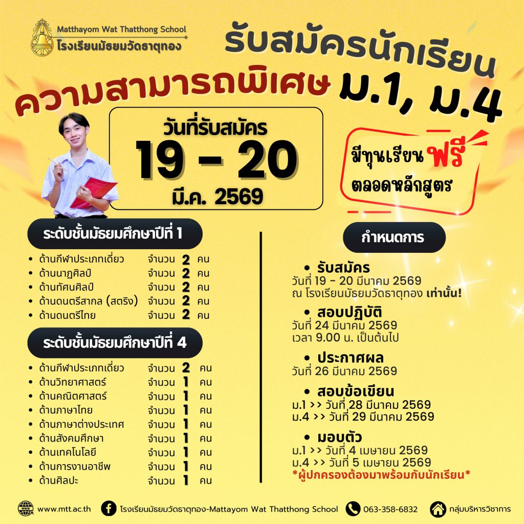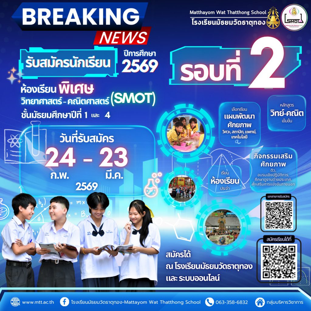 งานรับนักเรียน ปฏิทินการรับนักเรียนใหม่ประจำปีการศึกษา 2569 รับสมัครห้องเรียนพิเศษ สมัครห้องเรียนพิเศษ SMOT รับสมัครห้องเรียนระหว่างชั้น สมัครนักเรียนระหว่างชั้น รับสมัครนักเรียนห้องเรียนปกติ รับสมัครนักเรียนนักกีฬาฟุตซอล ลงทะเบียนล่วงหน้า รับสมัครนักเรียนความสามารถพิเศษ